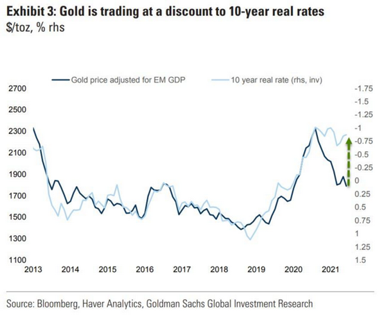 高盛同时指出,黄金之前跑输实际利率,是由于强劲的全球经济增长势头,以及资金转移到风险资产。如果经济复苏的信心发生变化,比如经济增长放缓超预期或者新的新冠变种病毒出现,金价将有很大空间去追赶实际利率水平。在这种情况下,金价有望达到2200美元。如果新兴市场经济体以美元计算的GDP受到冲击,这种情况下金价的上行空间会窄一些,不过仍将有非常明显的上涨。