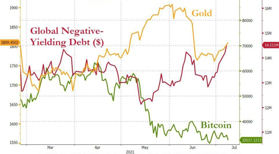 不过金融博客ZeroHedge在分析高盛的研报时注意到,随着全球负收益率债券规模六月下旬至今扩大,金价出现了上涨。与之形成鲜明对比的是,数字货币表现低迷,比特币最新跌破了33000美元的关口,而以太坊在即将到来的硬分叉之前也出现了显著下跌。