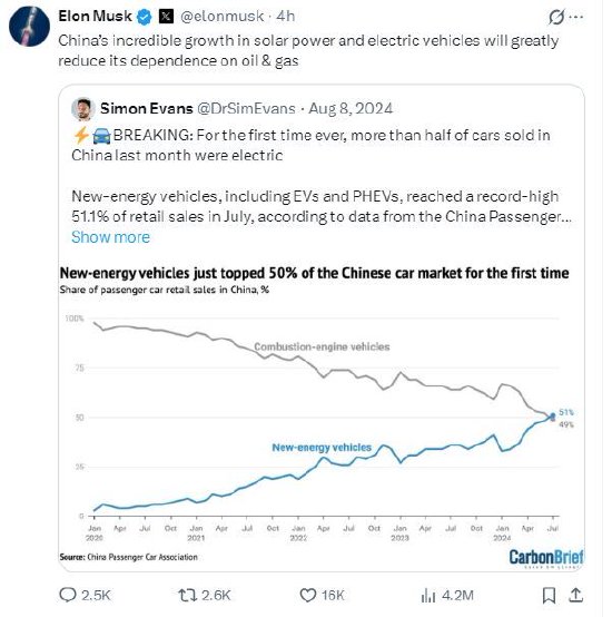 马斯克回应称:“中国在太阳能和电动汽车领域的惊人增长将极大地降低对石油和天然气的依赖。”
