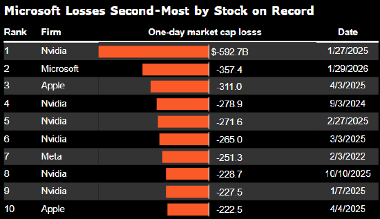 历史上唯一一次市值单日缩水金额比这更大的,是英伟达去年在DeepSeek推出低成本AI模型后创下的5930亿美元纪录。彭博汇编的数据显示,微软市值变动金额超过了逾90%的标普500指数成分股的市值本身。